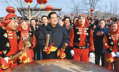 在村民邀请下,胡锦涛拿起鼓槌,擂响大鼓。在声声有力鼓点引领下,金狮腾得更高,秧歌扭得更欢,村民们脸上的笑容更灿烂了。