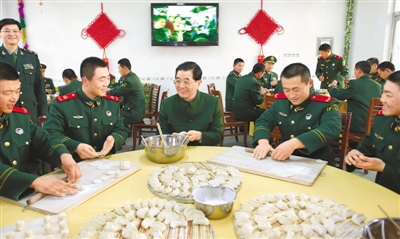 胡锦涛一边包饺子,一边同身边的战士拉家常。老家过年有什么风俗?在家里包过饺子吗?连队春节伙食是怎样安排的?……胡锦涛问得亲切,战士们答得朴实。胡锦涛动情地对战士们说,春节是合家团圆的日子。但由于工作需要,你们坚守岗位,不能回家和亲人团聚,尤其是刚到部队的新战士难免会想家。你们用自己的奉献换来了万家团圆,全国人民感谢你们。他还特别叮嘱部队干部,一定要把战士们节日期间的生活安排好,让大家过一个欢乐祥和的春节。