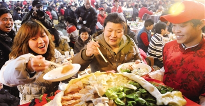 2月2日,大年三十,北京大兴区留民营村,村民正在品尝各种口味的饺子。当天,该村举办一年一度的千人饺子宴。全村老少欢聚一堂,其乐融融。 本报记者 赵 晶摄