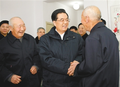 胡锦涛走进中心为优抚老人、五保老人安排的居室,同老人们一起拉家常,关切地询问他们的身体和生活情况。老人们你一言我一语告诉总书记,在这里吃得好、穿得好、住得好,老来享福了。胡锦涛听了十分高兴,他说:“看到你们在这里受到良好照顾,生活得很舒心,我就放心了。”总书记请老人们保重身体,并祝他们健康长寿。