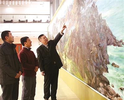 巨幅全景油画《山海奇观——崂山》日前面世。该作品用现实主义和浪漫主义结合的手法,勾画描绘了“海上第一名山”——崂山的山海景观在春天的奇秀景色。 目前,该油画展示于崂山风景区管理局办公楼大堂。 本报记者 刘 成摄