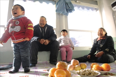 图1:“农家乐”已成为北京市平谷区许多乡村的支柱产业。平谷区南独乐河镇峨嵋山村大力发展“农家乐”民俗旅游业,既改善了生态环境,又大大提高了农民收入。新春佳节之际,四世同堂的村民杨宝林(左二)一家欢聚一堂,好年景好心情,儿女们忙着做团圆饭,杨宝林和老伴望着孙子孙女乐得合不拢嘴。