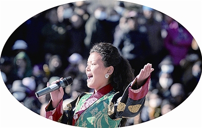 2月3日,一名歌手在拉萨宗角禄康公园内唱歌。来自西藏自治区歌舞团、藏剧团、话剧团联合举办一场大型文艺表演活动,以丰富节日期间广大群众的文化生活。 新华社记者 普布扎西摄