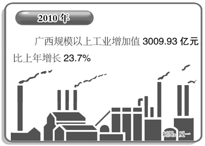 工业生产增长较快,企业效益创历史新高是去年广西经济运行的最大亮点。据介绍,2010年全年全区规模以上工业增加值3009.93亿元,比2009年增长23.7%,增速比2009年加快5.5个百分点。