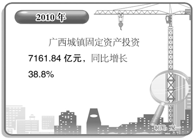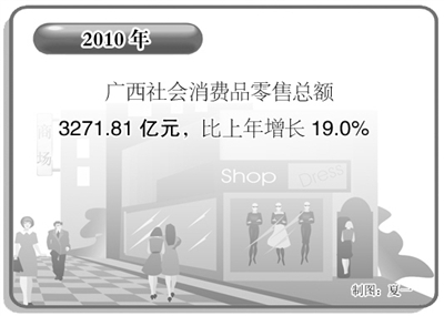本报讯 记者周骁骏 童政报道:2010年,广西全年经济规模再上新台阶,经济增速创近3年来新高,连续9年实现两位数增长,经济运行质量和效益明显提高,民生继续改善。其中,多项经济指标在全国位居前列:2010年全区规模以上工业增加值3009.93亿元,比上年增长23.7%;城镇固定资产投资7161.84亿元,同比增长38.8%;社会消费品零售总额3271.81亿元,比上年增长19.0%。