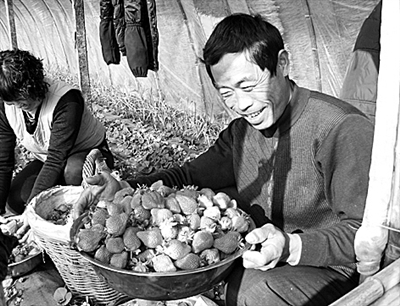 图为山东省平度市麻兰镇东沙窝村草莓大棚里,农民宋进启、相华娟夫妇正在收摘草莓。他们家共种了7亩草莓大棚,预计纯收入10万元。这个不足百户的村庄共有大棚草莓350亩,户均纯收入4万元,是青岛市“一村一品”专业村。 本报记者刘成 通讯员孙京信摄影报道