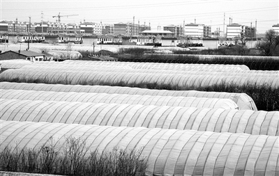 ◀昔日的呼和浩特城郊赛罕区大台村,民房破旧,村容凌乱。 ▼如今,大台村村民已住进高楼,就连他们的蔬菜大棚也整整齐齐。 彭晓明摄