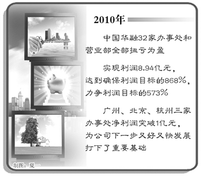 赖小民:2010年是中国华融实现“做强主业、做大利润、做响品牌、不断增强可持续发展能力”战略的重要一年,也是实现跨越式、超常规发展的一年,经营业绩创历史新高。2010年,中国华融32家办事处和营业部全部扭亏为盈,广州、北京、杭州三个办事处的净利润突破1亿元,为公司下一步又好又快发展打下重要基础。