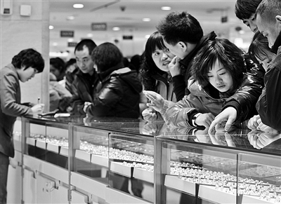 2月7日,菜百的黄金戒指柜台前围满了前来选购的顾客。 兔年新春,兔子造型的黄金饰品在春节期间格外走俏。菜百为此开设兔年新品展柜,陈列各式各样造型新颖的兔年新款黄金饰品。北京市商务委相关工作人员说,春节前4天,菜百的销售额累计同比增幅高达88.8%。 新华社记者 张 宇摄