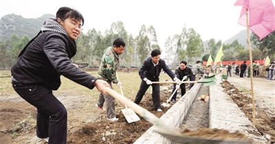 2月12日,在广西来宾市兴宾区蒙村乡长叨村,当地干部和村民一起兴修水利。