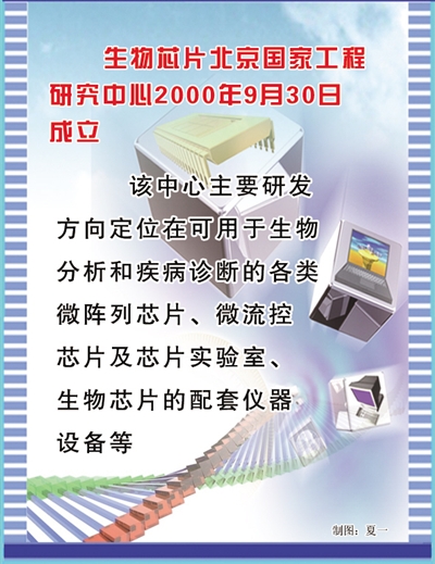 2000年9月30日,生物芯片北京国家工程研究中心正式成立。该中心主要研发方向定位在可用于生物分析和疾病诊断的各类微阵列芯片、微流控芯片及芯片实验室、生物芯片的配套仪器设备等。