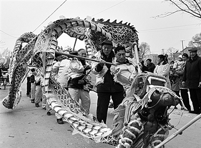 图1:在江苏南通各地春节的庙会上,龙舞表演是不可或缺的。
