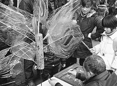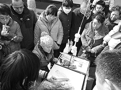今年庙会的一大特色是追忆童年。四五十岁的中年人,二三十岁的年轻人,手里都拿着缠糖,擎着冰糖葫芦,边走边玩。几乎已成文物的拉洋片也出现在大明湖边,很多好奇的小朋友围上前来,打量这种古老的“电影”。糖画艺人向游客们展示着高超的技术,一转眼的工夫,栩栩如生的鲤鱼、大龙和兔子就做好了。不仅是孩子们,很多两鬓泛白的成年人也愿意花上几元钱,重温一下儿时的欢乐。