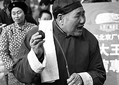 图4:北京厂甸庙会一向以书籍古玩、字画文具独秀于林,自古便以“文市”著称(下图);同时也有各种民俗表演,左图为著名的叫卖吆喝大王臧鸿正在表演传统叫卖。