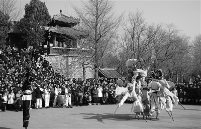 图5:济南大明湖文化庙会上,游客正在观看高跷表演。 本报记者 张 忱摄