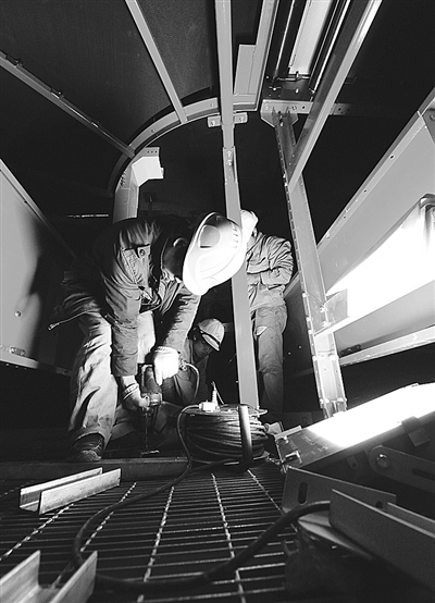 2月10日,工人在进行昆明新机场行李轨道安装。2011年以来,新机场建设取得较大进展,主体工程及各项配套设施建设全面推进。 新华社记者 秦 晴摄