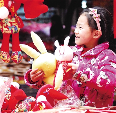 在江西省九江市一家商店内,一名女孩正在选购兔年礼物。 胡国林摄(新华社发)