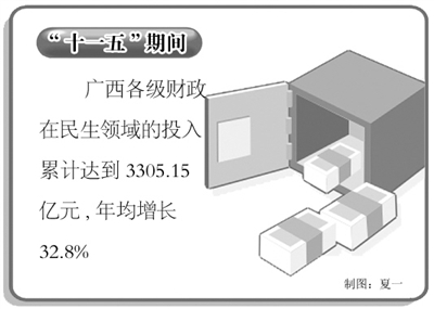 本报讯 记者童政报道:记者从广西壮族自治区十一届人大四次会议上获悉,“十一五”期间,广西各级财政在教育、卫生、社会保障和就业、文化等民生领域的投入累计达到3305.15亿元,是“十五”的3.61倍,年均增长32.8%。