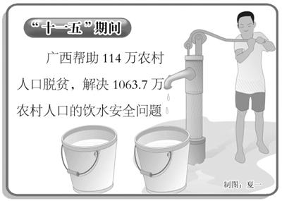 “十一五”期间,广西全区扶贫开发、以工代赈、移民搬迁、兴边富民行动和大石山区人畜饮水工程建设大会战扎实推进,大石山区五县、桂西五县、重点库区等基础设施建设大会战以及桂西北少数民族村寨改造全面完成。5年帮助114万农村人口脱贫,解决1063.7万农村人口的饮水安全问题,农村和华侨农林场危房改造26.23万户,16.34万户城镇居民享受廉租住房。