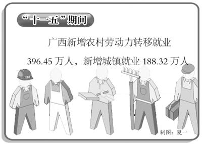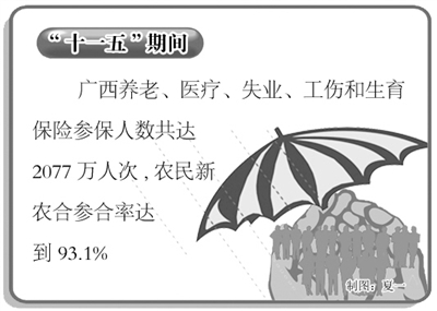 “十一五”期间,广西全区社会保险待遇大幅度提高,养老、医疗、失业、工伤和生育保险参保人数共达2077万人次,比“十五”期末增加997万人次;新型农村合作医疗农民参合率达到93.1%;220多万农村居民参加新型农村养老保险。建成五保村6852个,集中供养对象10万人。64万城市居民和316万农村居民享受最低生活保障,基本实现应保尽保。连续5年全力为民办实事,群众最关心的切实利益问题得到有效解决。