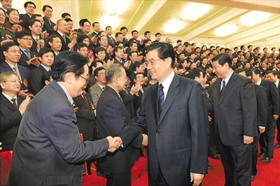 上午9时许,胡锦涛等中央领导同志来到会见大厅,全场响起热烈的掌声。胡锦涛等高兴地同代表们亲切握手,向辛勤工作在党建研究战线的同志们表示诚挚的敬意和问候。