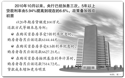 2月8日晚,中国人民银行决定自2月9日起上调金融机构一年期存贷款基准利率0.25个百分点,其他各档次存贷款基准利率相应调整。这是央行今年以来首次上调利率,也是继去年10月和12月以后,第三次上调利率。除了利率调整外,春节前国务院公布的八条最新的楼市调控政策(以下简称“新国八条”)也提高了二套房贷款首付款的门槛;2月9日住房公积金存贷款利率上调;不少商业银行还在不久前取消了首套房贷利率优惠,如光大、浦发等股份制银行首套房贷利率只能执行基准利率,建行等国有银行表示目前首套房贷利率暂时可下浮15%。