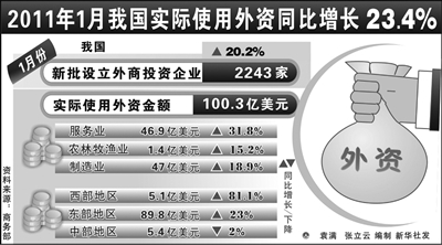 本报北京2月17日讯 记者李予阳、实习生赵凌从商务部获悉:2011年1月,全国新批设立外商投资企业2243家,同比增长20.2%;实际使用外资金额100.3亿美元,同比增长23.4%。