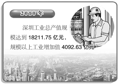 据介绍,2010年,深圳工业规模再创新高,发展质量进一步提升。全市规模以上工业增加值4092.63亿元,增长13.8%,比上年提高5.1个百分点,工业增加值规模比国际金融危机发生前的2008年增加564.86亿元;工业总产值规模达到18211.75亿元,比危机前增加2351.64亿元。均创历史新高。全年工业经济效益综合指数188.7%,同比上升7.6个百分点。