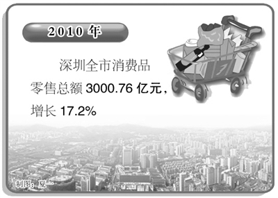 社会消费品零售总额增速继续高于GDP增速。2010年,深圳全市消费品零售总额3000.76亿元,增长17.2%,从趋势看,第一至第四季度累计增速分别为18.3%、16.1%、15.7%和17.2%,一季度由于受同期低基数影响,表现为增速相对较高,全年呈高开,回稳态势,12月末累计达到次高点。扣除消费品价格因素,社会消费品零售总额增速已超过2008年水平。全市社会消费品零售总额增速高出同期GDP增速5.2个百分点。