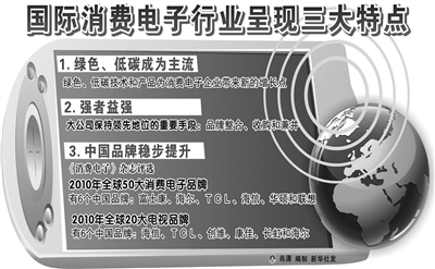 中国是率先从国际金融危机中复苏的主要经济体。随着全球经济继续从衰退中复苏,中国消费电子品牌在世界的知名度同步上升。本届拉斯韦加斯消费电子展期间,美国《消费电子》杂志评选的2010年全球50大消费电子品牌中,富士康、海尔、TCL、海信、华硕和联想等六大中国品牌入围。另外,在2010年全球20大电视品牌中,海信、TCL、创维、康佳、长虹和海尔占据六席,直追韩国和日本品牌,成为展会一大亮点。