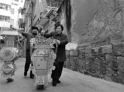 福建泉州花灯是国家级非物质文化遗产。图为代表性传承人李珠琴(右)送花灯参加2011年泉州元宵灯会。 新华社记者 魏培全摄