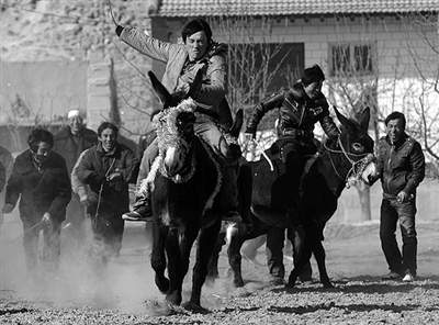 地处黄土高原的宁夏固原市海原县史店乡苍湾村农民举办了第十届农民运动会,图为农民正在赛驴。 新华社记者 王 鹏摄