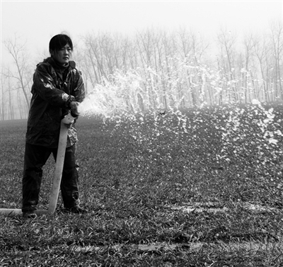 2月6日,河南省淮阳县许湾乡何庄农民在麦田内浇水。