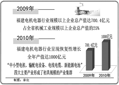 作为福建省重点扶持的五大产业集群之一,福建省电机电器行业在自主创新中不断发展壮大,2010年产值达1000亿元。