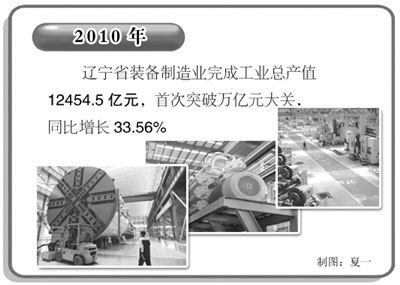 本报讯 记者张允强、通讯员杨忠厚报道:2010年,辽宁省装备制造业完成工业总产值12454.5亿元,首次突破万亿元大关,同比增长33.56%。从去年5月份开始,辽宁装备制造业单月产值连续8个月保持千亿元以上的增长规模,稳步驶上发展的快车道。