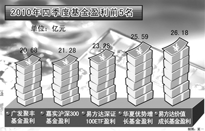 从单只基金来看,去年四季度赚钱最多的前5只基金依次是:易方达价值成长基金盈利26.18亿元,净值增长率高达9.63%,在2010年三季度、四季度连续两个季度成为最赚钱基金;华夏优势增长基金盈利25.59亿元;易方达深证100ETF盈利23.28亿元;嘉实沪深300基金盈利21.28亿元;广发聚丰基金盈利20.68亿元。此外,华夏300基金、中邮成长基金、汇添富均衡基金及广发小盘基金也以不俗成绩跻身去年四季度盈利前十位。