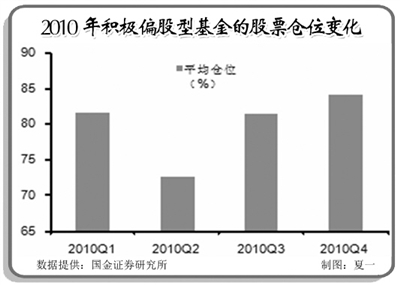 2010年四季度基金季度报告已全部披露完毕,700多只基金数据逐一亮相。据天相投顾统计显示,虽然2010年四季度末股票型基金平均仓位攀升至88.2%的历史高位,但季度环比增幅低于基金整体平均水平。而从单只股票型基金季度仓位变化分析,在部分股票型基金四季度猛增仓位数十个百分点的同时,也有不少基金大幅度降低股票仓位,股票型基金间仓位的首尾差距已高达33个百分点。业内人士认为,这种分化很可能影响2011年上半年的行情走势。