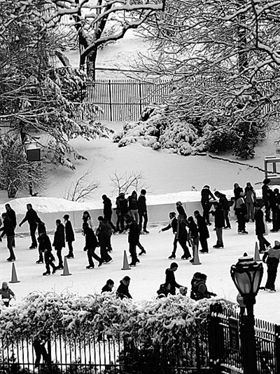 一场雪使美国纽约银装素裹,也给人们带来了几分雪趣。图为人们在纽约中央公园溜冰场溜冰。 新华社发