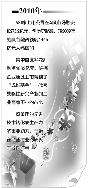 首先,要保障融资的规模和效率。2010年,531家上市公司在A股市场融资10275.2亿元,创历史新高,较2009年的股市融资额度4466亿元大幅增加。其中首发347家融资4883亿元。如此大规模的融资,使得许多企业通过上市得到了“成长基金”,这其中,代表战略性新兴产业的企业有着不小的占比。资金作为先进技术转化成生产力的重要助力,开始在这些行业的成长中发挥作用。