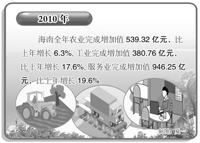 2010年海南全年农业完成增加值539.32亿元,比上年增长6.3%,工业完成增加值380.76亿元,比上年增长17.6%,服务业完成增加值946.25亿元,比上年增长19.6%,对经济增长贡献率达56.0%,引领经济快速发展。其中,在国际旅游岛建设的利好概念推动下,批发零售业等行业呈现快速发展势头,全年批发零售业增加值217.99亿元,增长23.2%。