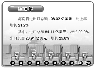 2010年海南外贸进出口呈现快速增长的良好势头。全年全省进出口总额108.02亿美元,比上年增长21.2%。其中,进口总额84.11亿美元,增长20.0%;出口总额23.91亿美元,增长25.8%,大企业、大项目成为外贸发展的主要动力。此外,与东盟贸易、边境小额贸易取得历史性突破,特色农产品出口位居全国前列。
