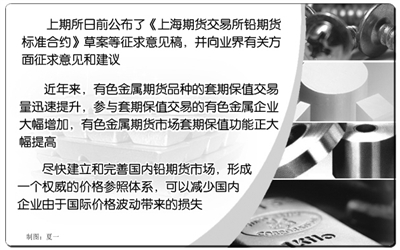 为进一步完善铅期货交易规则,防范风险,促进市场功能发挥,根据中国证监会《关于同意上海期货交易所开展铅期货交易的批复》的有关要求,上期所日前公布了《上海期货交易所铅期货标准合约》草案、《上海期货交易所铅套期保值交易管理办法(试行)》草案、《上海期货交易所风险控制管理办法》修订草案、《上海期货交易所交割细则》修订草案、《上海期货交易所套期保值交易管理办法》修订草案的征求意见稿,并向业界有关方面征求意见和建议。