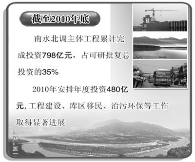 本报北京2月24日讯 记者李力 张雪报道:国务院南水北调办公室主任鄂竟平今天介绍,截至2010年底,南水北调主体工程累计完成投资798亿元,占可研批复总投资的35%。2010年安排年度投资480亿元(不含2010年12月增加安排河南省丹江口库区移民安置投资48.8亿元),工程建设、库区移民、治污环保等工作取得显著进展,为确保东线工程2013年通水、中线工程2014年汛后通水的目标奠定了重要基础。