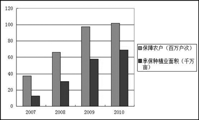 这些年来,尤其是“十一五”以来,我国农业保险发展迅速,风险保障和经济补偿功能日益凸显。为更好地加强对我国农业生产的扶持,2007年,中央财政首次在吉林、四川、湖南等地启动了保费补贴试点,开启了我国农业保险发展全新时代。当年,全国农业保险保费收入达51.8亿元,参保农户4982万户次,为农业生产提供了1126亿元风险保障。2008年至2010年,国家支持力度进一步加大,农业保险覆盖面进一步扩大,保险补贴试点由6省份扩展到28个省份,粮食主产区的13个省区全部被纳入到试点范围;补贴险种也已扩展到了玉米、水稻、小麦、大豆、棉花、花生、油菜、马铃薯等主要粮棉油作物以及橡胶树、青稞等地方特色险种。2010年,全国农业保险实现签单保费135.68亿元,支付赔款100.69亿元;承保各类农作物6.8亿亩,承保森林4.8亿亩,承保各类牲畜6.34亿头(羽),参保农户1.4亿户次,为农民提供了3943.1亿元风险保障。