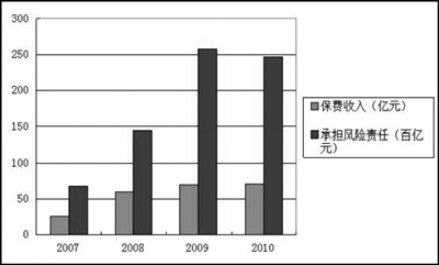 2010年,我国共有19家农险经营机构,人保财险、中华联合、安华、阳光农业、国元、安信等6家主要农险经营机构的业务规模占全国的96.61%,其中,人保财险2007年至2010年持续引领农险市场,市场占有率均在50%以上。2010年,人保财险农业保险保费收入70.58亿元,保费规模已跃居世界前列。
