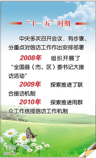 “十一五”时期是我国信访工作科学发展、创新发展、跨越发展的五年。在党中央、国务院的正确领导下,各地区各部门认真贯彻中央关于信访工作的一系列决策部署,着力强化源头预防,积极推动“事要解决”,探索创新体制机制,严格落实工作责任,推动信访形势发生积极可喜变化。