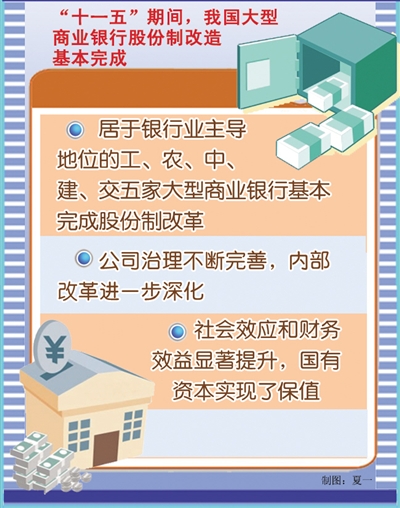 大型商业银行股份制改造基本完成。居于银行业主导地位的工、农、中、建、交五家大型商业银行基本完成股份制改革,公司治理不断完善,内部改革进一步深化,社会效应和财务效益显著提升,国有资本实现了保值增值。