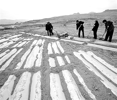 甘肃通渭县常河乡固河村村民在田地里覆膜。 新华社记者 聂建江摄