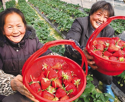 温室大棚在园区深处,红艳艳的草莓点缀在绿叶丛中,香甜的气味引得人摘了一篮又一篮。这20多亩草莓都是林阿姨承包的,她一边细心地为我们挑选熟透了的果实,一边介绍说,“这是进口品种的奶油草莓,一点儿农药没有,摘下来就能吃。”林阿姨拿出一个印有“滕头草莓”的包装盒,“滕头草莓现在是品牌啦,要卖40元一斤呢。”