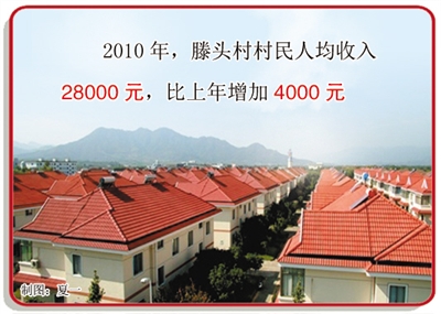 从1998年开始,滕头村开始兴建小康别墅群作为村民新居,如今大多数村民已搬进了小康别墅楼。他们还着力兴办集体福利事业,并为全体村民进行人身、财产保险,实现了“少有教、老有靠、病有医、户户有保险”的目标。2010年以前,村里每月给每位村民发放福利650元,年底还有分红,今年起福利涨到1000元,上了年纪的村民福利更高,每月还有500元至1000元的劳保。2010年,村民人均收入28000元,比上年增加4000元。